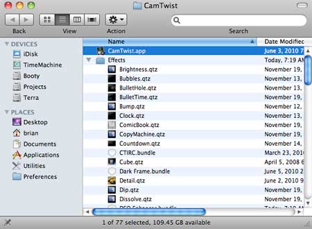 Using the Astro Filters with CamTwistTo use our Astro Filter Pack you need CamTwist - a program developed by Steve Green for video podcasting. CamTwist is a very powerful program because it allows you to choose a video source, apply effects (filters) to it, and then send the modified video stream to other video applications. CamTwist is the foundation that the Astro Filter Pack is built upon, and luckily, both are free! To install the Astro Filters in CamTwist, simply drop them into the Effects folder in the CamTwist folder: