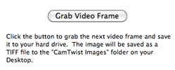 Frame GrabberThis lets you grab a frame of video and save it out as a TIFF file (how all of the screenshots here were made). The TIFF files get saved into a folder named "CamTwist Images" that will be created on your Desktop. You can put the Frame Grabber anywhere in CamTwist's effects stack so that it will save out the image at any point in the process. If you want to save out an unfiltered image then place it at the top of the stack, or if you want to save out the image after all of the filters have been applied then place it at the end. |