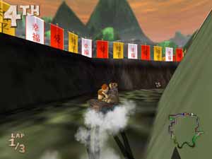 Most racing games (and Cro-Mag Rally is no exception) have a gameplay feature which gives players in back and advantage over those in front, thus allowing the players in back to catch up. In Cro-Mag Rally, you are given a little extra speed the farther you fall behind in the Place rankings. For example, you may notice that the Geode Cruiser goes about 20% faster when it is in 6thplace compared with its speed in 1st place. What this boils down to is the fact that even if you are in 6th place and all seems lost, you actually stand a fair chance of winning the game. However, the CPU cars also have the same advantage, so keep that in mind.