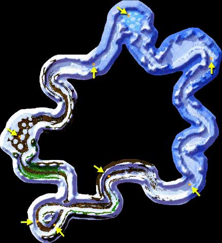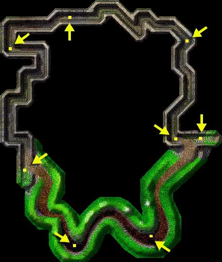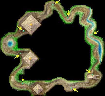There are a lot of shortcuts in this track, but some shortcuts will cause you to miss an Arrowhead in Tournament mode. Therefore, it is a good idea to try and get all of the Arrowheads on the first lap, and then to take all of the shortcuts over the hills on the next two laps.