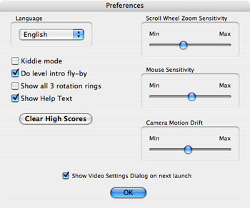 The Language pop-up menu will allow you to select which language you want the game's text to appear in. The Kiddie Mode option will give you unlimited inventory parts when playing a level. This is basically a cheater mode. The Do Level Intro Fly-by option will turn on or off the camera fly-by introduction to each level. The Show All 3 Rotation Rings option is off by default. When you select a puzzle piece it will show you the current rotation ring for the axis that the camera is currently looking down. But if you check this option, then it will always show you all 3 axis rings (x, y, and z) so that you can rotate the part on any axis without having to move the camera. The Show Help Text option will display some help text at the bottom of the screen when you move the cursor over things. The Scroll Wheel Zoom Sensitivity slider adjusts how sensitive your mouse's scroll wheel is when zooming in/out during the game. The Mouse Sensitivity slider adjusts the sensitivity of the mouse motion when rotating, panning, or zooming the camera. This does not affect the sensitivity of the cursor motion as that is determined by your System settings for mouse sensitivity - the game cursor tracks the real cursor. The Camera Motion Drift slider lets you adjust how much the camera continues to drift after you let go of the mouse button. The min setting will cause the camera to stop almost immediately when you release the mouse button, and the max setting will cause it to drift for a long time. Setting this to the middle is best in most cases, but you may want to move it towards min if you're using the trackpad on a laptop. Clear High Scores does what it implies: it will erase all of the current high scores. If the Show Video Settings Dialog is checked then the next time you launch Enigmo 2 the Video Configuration Dialog will appear. |