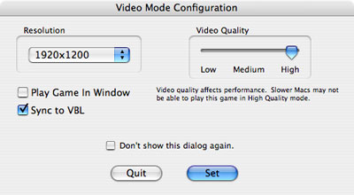 The Video Configuration dialog is where you set the resolution and quality of the graphics that the game will draw. Optionally, you can select the Play Game in Window checkbox to play in a window instead. The window will always be 1/2 the size of your current display, and the Resolution setting will have no effect in this case. The Resolution pop-up menu sets the screen resolution you wish to play the game with. If you have a fast graphics card in your Mac then you will want to choose the highest resolution that your display supports. However, the higher the resolution, the slower the game may run on slower video cards, so if the game is sluggish you may need to reduce the resolution to get some performance back. The Sync to VBL checkbox tells the program to synchronize with the display's vertical blanking. This will eliminate any visual "tearing" when the camera moves, however, in certain cases it may also make the animation a little jerky. If you're on a fairly new and fast Mac then you'll probably want to leave this on, but if you're on an older, slower Mac then you might want to turn if off if you see jerky animation. The Video Quality slider sets various effects and graphic elements, and it also affects performance. Generally, you will want to leave it set to High, but if the game is sluggish and running slowly then you should knock this down to Medium or Low. If your Mac is a G4 and is less than 1.25ghz, then you'll probably have to select Medium or Low. But if you have a G4 that is faster than that, or if you're on a G5 or better then High should work fine. |