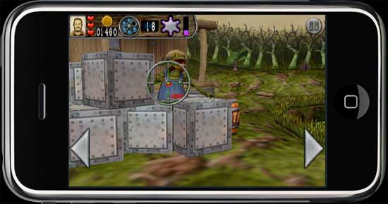 You have a limited amount of ammo. In the statbar at the top of the screen you will see how many bullets are left in your revolver, and the number next to it indicates the number of reloads you have remaining. To get more ammo, you shoot wooden crates which will reveal Powerups. Some Powerups are Ammo Boxes which you shoot to get more ammo. There is also a Shield Powerup which is represented by a purple square and a sheriff's badge. Your remaining shield is shown in the statbar as the purple meter. When you run out of shield Billy will only be able to take a few direct bullet hits before he is killed. The arrows on the left and right sides of the screen allow you to turn left and right. Once you have cleared the entire area of all of the outlaws a new flashing button will appear. Press it when you are ready to walk to the next area. NOTE: To make it easier to see what you're doing, the targeting reticle is normally offset from where you tap the screen. This way your finger does not obscure what you are shooting at. In the game's Settings Dialog you can turn the Reticle Offset off if you like, and that will cause the reticle to be positioned directly under your finger where you tap. |