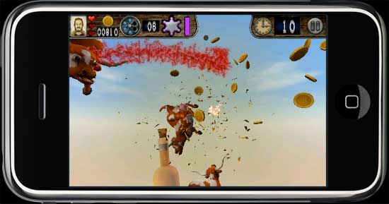 It is possible to get killed in the Target Practice levels. There are TNT barrels that will explode if you accidentally shoot them, and that will damage your shield. Occasionally you will see a skull - don't ever shoot that! Shooting the skill will kill you instantly. If you die during the Target Practice level you lose a life and any bonus points, and will have to try it again. Shooting a whisky bottle will make you drunk and it is hard to hit anything in drunk mode. Hitting a Time Barrel will give you more time, and hitting an Ammo Box will give you more ammo. You get points for splattering outlaws and Kanga-Cows, and coin barrels are good too. The small red chile peppers give you lots of points if you can hit them. |
