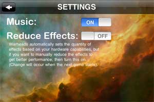 REDUCE EFFECTS: Warheads uses a huge amount of particle and other graphics effects. Uses with iPhone 3GS or faster devices will get the full glory of all of these effects, and the game will automatically reduce the particles on slower devices such as the older iPhone 3G. If you would like to increase the game's frame rate a little more then you can opt to turn the Reduce Effects option on. This will cut most particle effects and such by 50%.