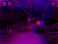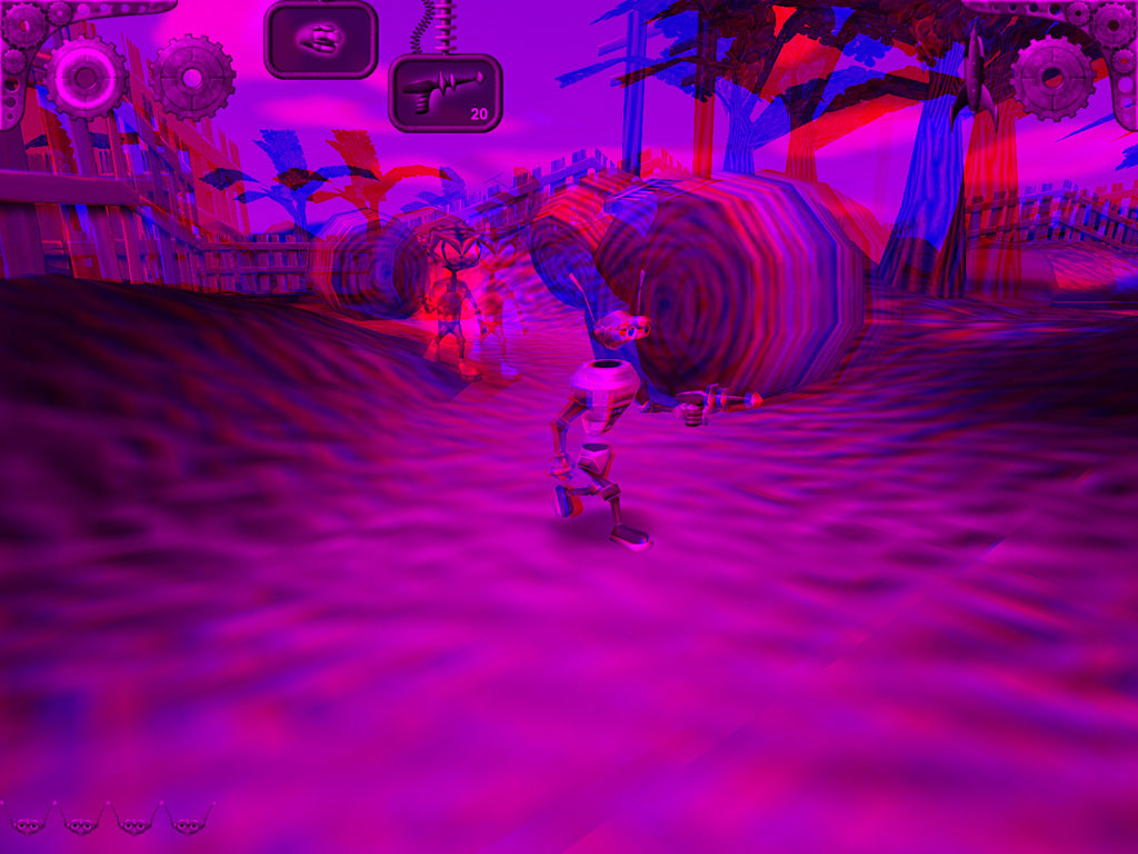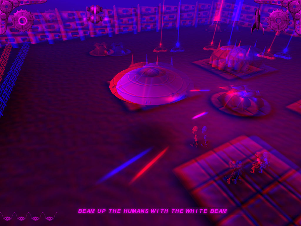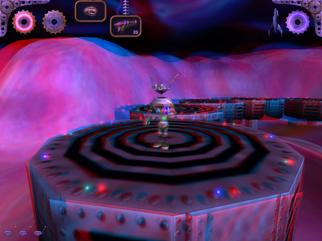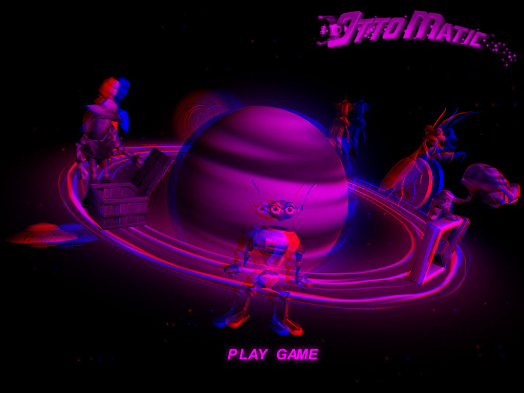Otto Matic version 2.0 now has an option for 3D "anaglyph" glasses for a truly immersive experience. Anaglyph glasses are the traditional cardboard 3D glasses that have been used for over 50 years in film and print. The first game of ours to use 3D glasses was Nanosaur 2, and the boxed version of Nanosaur 2 comes with two pairs of 3D glasses. THESE ARE SPECIAL ANAGLYPH GLASSES WHICH WE HAVE HAD CUSTOM MADE WITH FILTERS CALIBRATED FOR APPLE LCD DISPLAYS. You can use stock Red-Cyan anaglyph glasses from other sources, but they probably won't work as well as ours since non-calibrated glasses will have more color ghosting which diminishes the 3D effect. You can also use the older Red-Blue style of anaglyph glasses, but the images will be darker and less colorful. There are two ways to get our custom "Nanosaur 2" Red-Cyan anaglyph glasses: