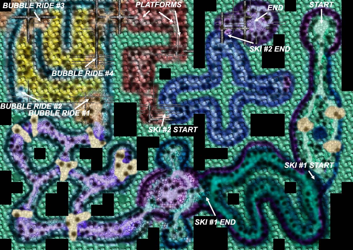 LEVEL MAP GENERAL NOTES Even though this is only the second level in Otto Matic, it is probably the hardest. What makes it so hard is mainly the length of the level since it is the largest of all of the levels in the game. There are arrows places around the terrain to help guide you on the path. If you follow these arrows it will make the level twice as easy. When you get to your rocket at the end of the level, something different happens. Instead of boarding the rocket like in the other levels, here you get sucked down into the planet's core. The visual here is confusing to many people, but rest assured that when you see Otto squirming and being sucked under, that's a GOOD thing. The next level takes place in the core of Planet Snoth. FREEZING ENEMIES The primary weapon on this planet is the Freeze Gun. Here, when you shoot an enemy with the freeze gun it will stay frozen for several seconds before it either thaws out, or the enemy cracks the ice. When an enemy is frozen, just give it a solid punch to shatter it. When you shatter a frozen Slime Enemy it will explode into several smaller slime blobs which will then thaw. But if you gather the small blobules before they thaw, you will get powerups according to the color. SKIING There are two skiing areas on this planet. You pick up the magnet powerup which will attract you to the metal dragon and that gets you going. On both skiing tracks, you will go around the course TWO times. On the second pass, the metal dragon will go close enough to the exit zone for you to hop off. If you miss it, then you've got to keep skiing for two more laps until the dragon goes by the exit again.