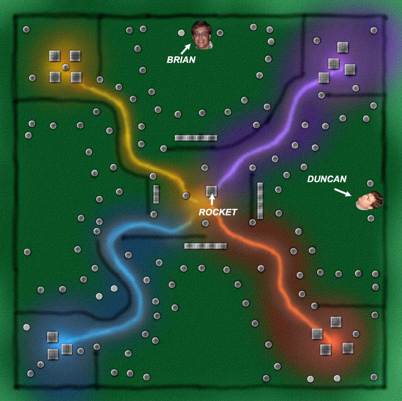 LEVEL MAP SAUCER BEAMS Using your saucer which you commandeered on the previous level, you must try to free as many humans from the POW Camp as you can. The saucer has two types of beams: the Destructo-Beam and the Abduction-Beam. Use the red Destructo-Beam to blow up just about anything on the ground, but mainly you want to blow up the huts where the humans are being kept. Blowing up a hut will free the humans. Once you are ready to gather the humans you have freed, you need to switch to the Abduction-Beam which is the white beam. Activate it, and then start vacuuming up as many humans as you can. The saucer can hold a maximum of 10 humans at a time. THE ROCKET When you have some humans you would like to save, fly over to the rocket ship and the computer will take over when you are close enough. The humans will be beamed down and they will run into your rocket. Each saved human will give you a little bit of rocket fuel. It takes at least 20 humans to get enough fuel to leave, but you can keep resucing humans for as long as you like to get more points before leaving. THE GUN TURRETS The moving and stationary vertical beams are deadly to the saucer, but they are fairly easy to avoid. The Gun Turrets, however, are tough. The strategy with them is to sneak up behind them, get a running start with your Destructo-Beam activated, and then plow them over. A good player should be able to complete this level with only being hit a few times by a turret shot. THE HEADS No, zapping our heads which we've drawn into the terrain does not get you bonus points! They're just there for fun. |