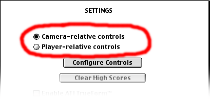 MOVING OTTO & THE CAMERA The controls and camera motion in Otto Matic have been closely modeled after those from other action-adventure games on various game consoles such as Nintendo, Playstation, Dreamcast, etc. Most PC / Mac games, however, use much stiffer controls and camera movement, therefore, the controls in this game may seem awkward at first to many players who don't play very many console action-adventure games. The default control setting is Camera-Relative Controls, however, you can switch to Player-Relative Controls by clicking on the setting in the game's Settings dialog: