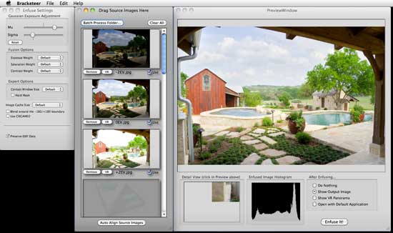 PangeaVR is a free viewer for the iPhone that uses OpenGL to display full-screen panoramas with incredibly high performance. PanoPreviewer is a Photoshop plug-in for previewing panoramas while editing them. Bracketeer is a utility for doing HDR compositing with exposure bracketing. |