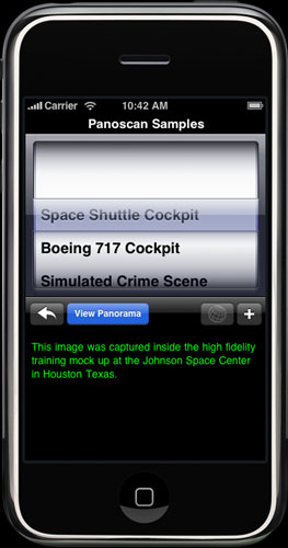 Whenever a portfolio is selected (from the Browser, Bookmarks, or from a URL) you will be presented with this screen. Here you can scroll through the list of panoramas in the portfolio. Below the list is a description of the currently selected panorama. To exit this screen press the back-arrow button. To add this portfolio to your Bookmarks press the + button. To download & view the selected panorama, press the Download & View button. When you download a panorama, a progress indicator will appear. It may take several seconds to convert the image into a VR panorama after the download is complete, depending on the resolution of the image. |