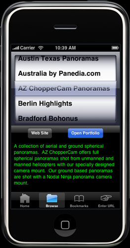 Every time you launch PangeaVR it downloads the latest "Portfolio" database off of our server. This database contains a list of VR panorama sites that support PangeaVR. If you want your site added to the database, you'll find that information here. To see the portfoio list, click the Browse tab at the bottom of the screen. Here you can scroll thru the list of portfolios, and as you select one a summary about the site appears below it. The On the Web button will take you to the photographer's web site in Safari, but to view their list of panoramas in PangeaVR, click the Open Portfolio button. When you do this, PangeaVR will download the latest list of panoramas from the photographer's web site, and present them to you to view. |