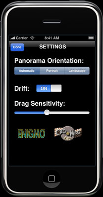 PANORAMA ORIENTATION: This determines which way is up. In Automatic mode, you can spin the iPhone and the panorama will always remain level. DRIFT: When on, the panorama will decelerate when you stop dragging it. DRAG SENSITIVITY: Sets how quickly the panorama spin accelerates as you drag on it. This only applies when Drift is turned On. |