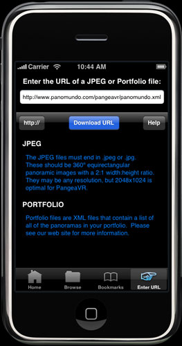 To do this, you simply format the URL's with "pangeavr://" at the beginning. So, to have your portfolio automatically open you might make a URL like this: pangeavr://www.yoursite.com/portfolio.xml Or, to automatically view a specific panorama it might look like this: pangeavr://www.yoursite.com/panorama.jpeg |
