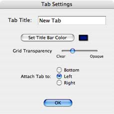 Here you can name the Tab, set the titlebar's color, set the transparency of the tab window, and set the screen edge that you want the Tab attached to. It should be noted that you never need to Save anything in TabMeister. Every time you edit a Tab the application saves the settings automatically for you. NOTE: Clicking on a tab does not bring the TabMeister application to the front. Whatever application you are using will remain active, but if you need to bring TabMeister to the front in order to access its menus, then click on the TabMeister icon in the Dock.